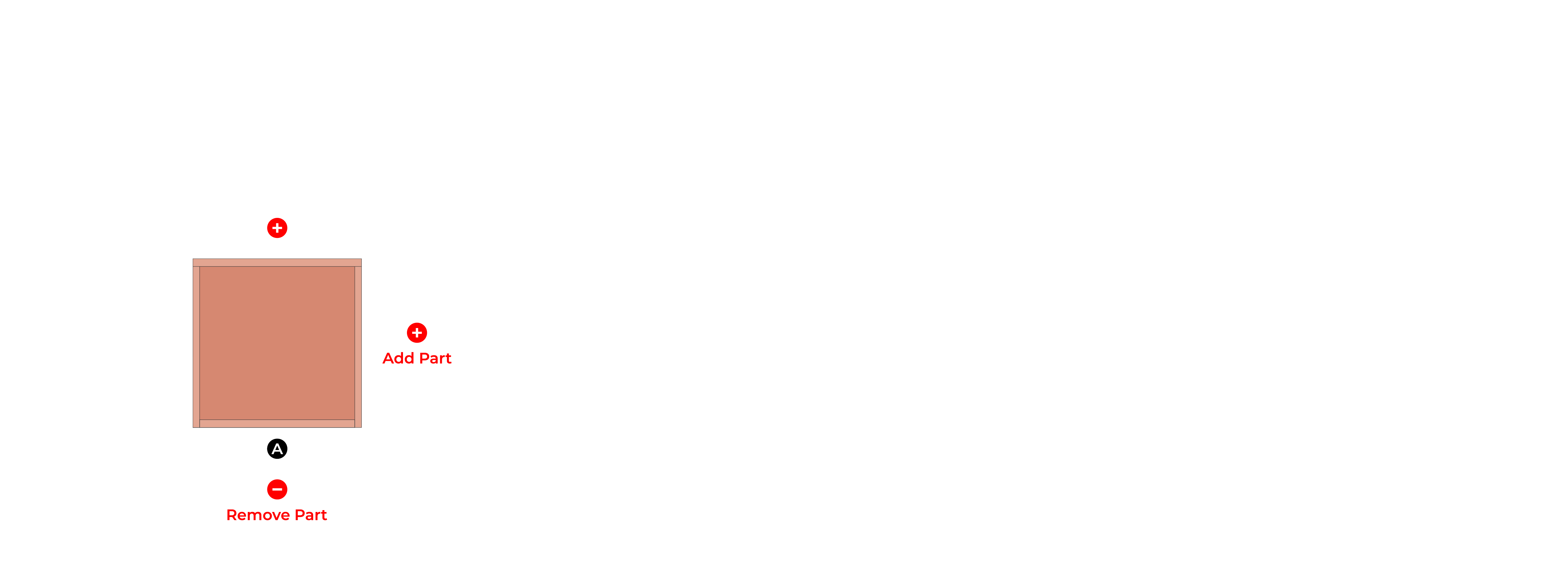 Build your furniture by combining parts side by side and stacking them on top of each other to meet your desired width and height. You can add up to 7 parts horizontally (Part A–Part G) and an additional part on top of the bottom compartments. This allows a maximum width of 5.53 m (7 × 79 cm) and a maximum height of 3 m (2 × 1.5 m). The depth is adjustable between 15 cm and 70 cm to suit your space and needs.